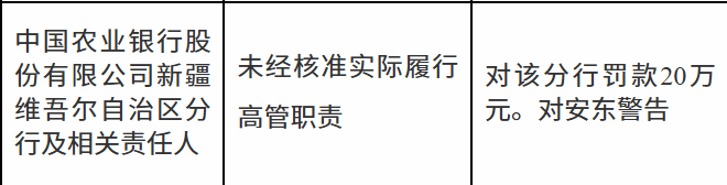 亚晶金融 中国农业银行新疆维吾尔自治区分行因未经核准实际履行高管职责被罚款20万元