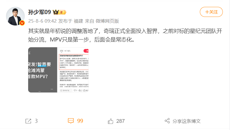 客观来讲,智界面世一年多的时间里有高光也有低谷,但这些都是鸿蒙智行模式下华为与合作伙伴必经的磨合阶段。据悉,奇瑞内部已明确将智界列为“第一优先战略项目”,星纪元首款MPV E08已停止开发,部分项目组成员转岗至智界。这意味着在奇瑞内部也是全力支持智界。