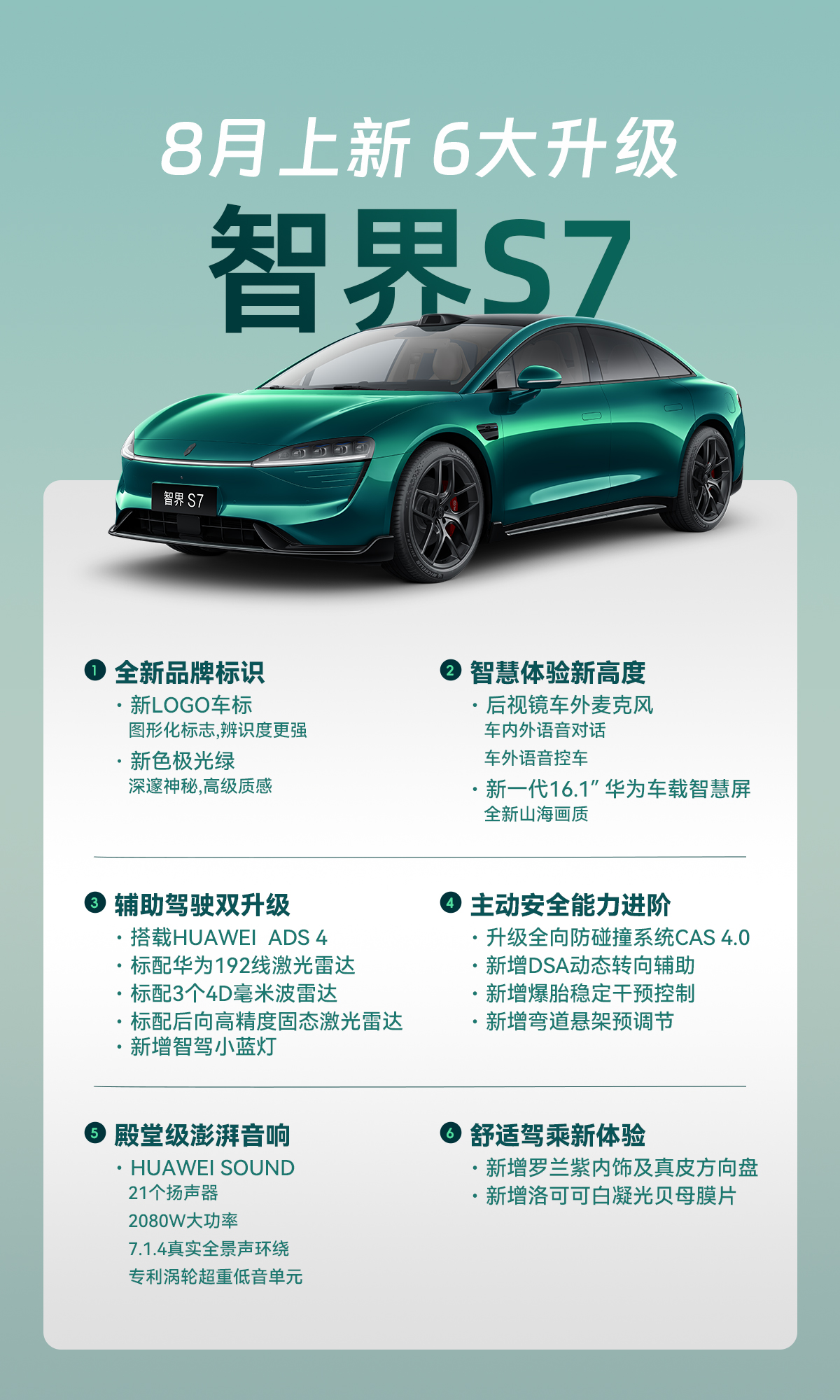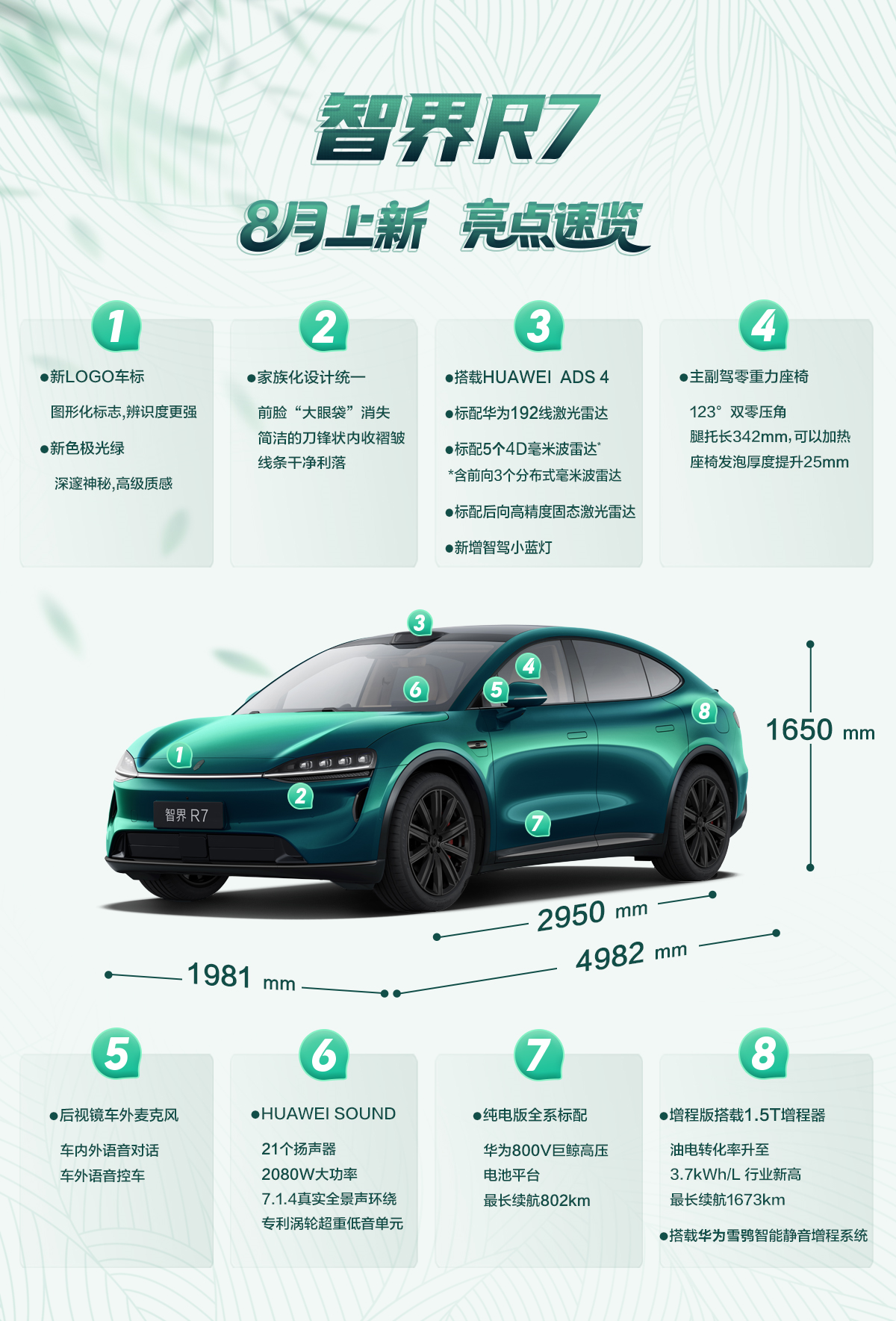 智界作为纯血鸿蒙,一直是华为诸多新技术的落地品牌。华为“巨鲸”电池、iDVP智能数字平台、途灵平台、雪鸮增程等均在智界车型首发。据目前各方消息,智界新款车型除了家族最新的极光绿配色外,车内新增罗兰紫内饰,并在全球首发华为手机洛可可白工艺的凝光贝母内饰膜片。到本月底正式上市,相信会有不少新技术惊艳亮相。